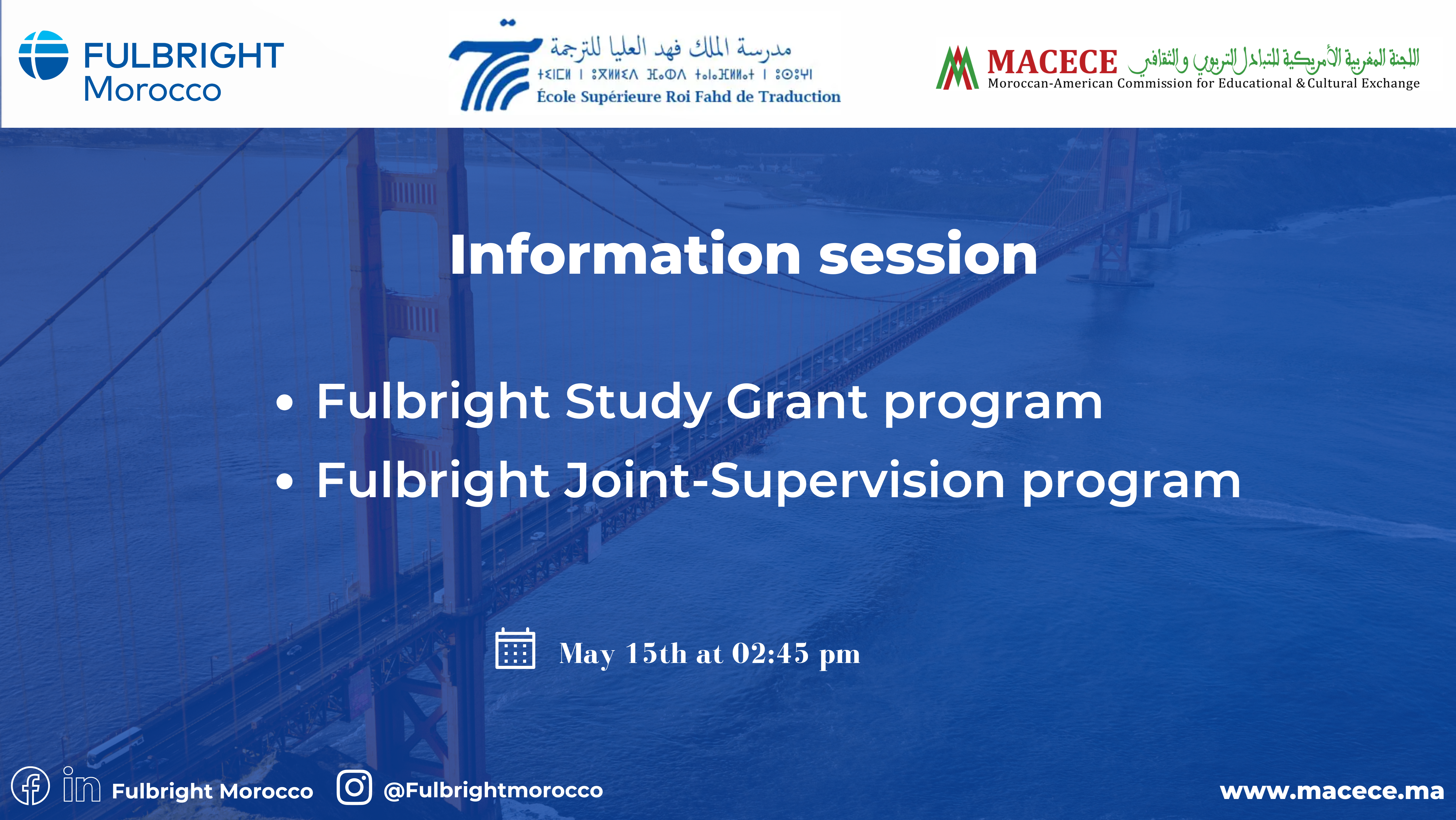 تنهـي إدارة مدرسـة الملك فهد العليا للترجمـة إلـى علم الطلبة أنها تنظم لقاءا تواصليا يؤطره وفد من اللجنة المغربية الأمريكية للتبادل التربوي والثقافي (MACECE) يوم الأربعاء 19 ماي 2024. وخلال هذااللقاء سيتم التعريف ببرنامج التبادل التعليمي والثقافي الدولي الأمريكي وخاصة بمنح البحث والدراسة والتعليم: