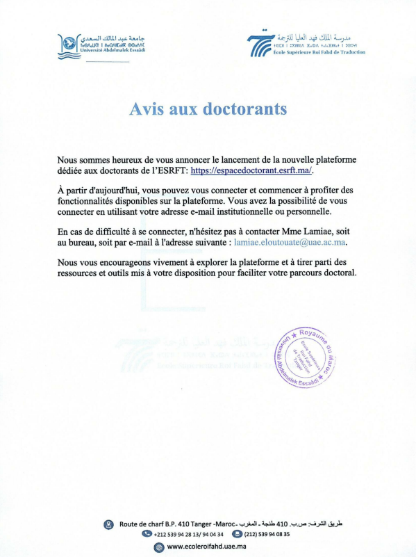 Nous sommes heureux de vous annoncer le lancement de la nouvelle plateforme dédiée aux doctorants de l’ESRFT: https://espacedoctorant.esrft.ma/.