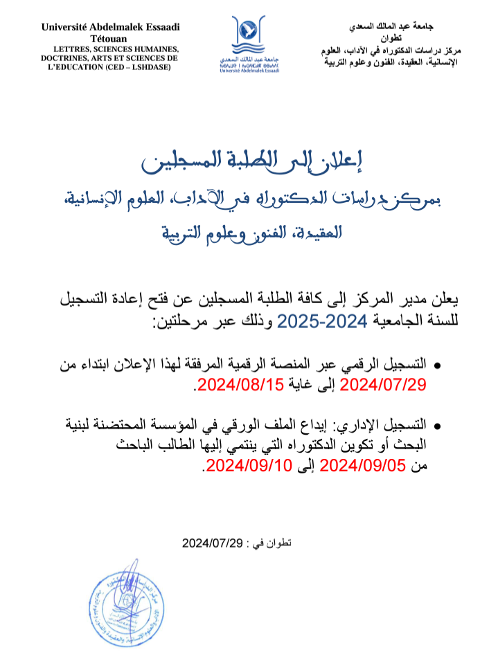 Actualités / إعلان إلى الطلبة المسجلين بمركز دراسات الدكتوراه في الآداب، العلوم الإنسانية، العقيدة، الفنون و علوم التربية