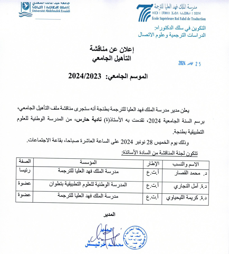 Actualités / إعلان عن مناقشة التأهيل الجامعي