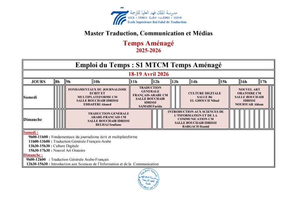 Actualités / Emploi du Temps S1 MTCM TA 25-26 (18-19 Avril 2026)