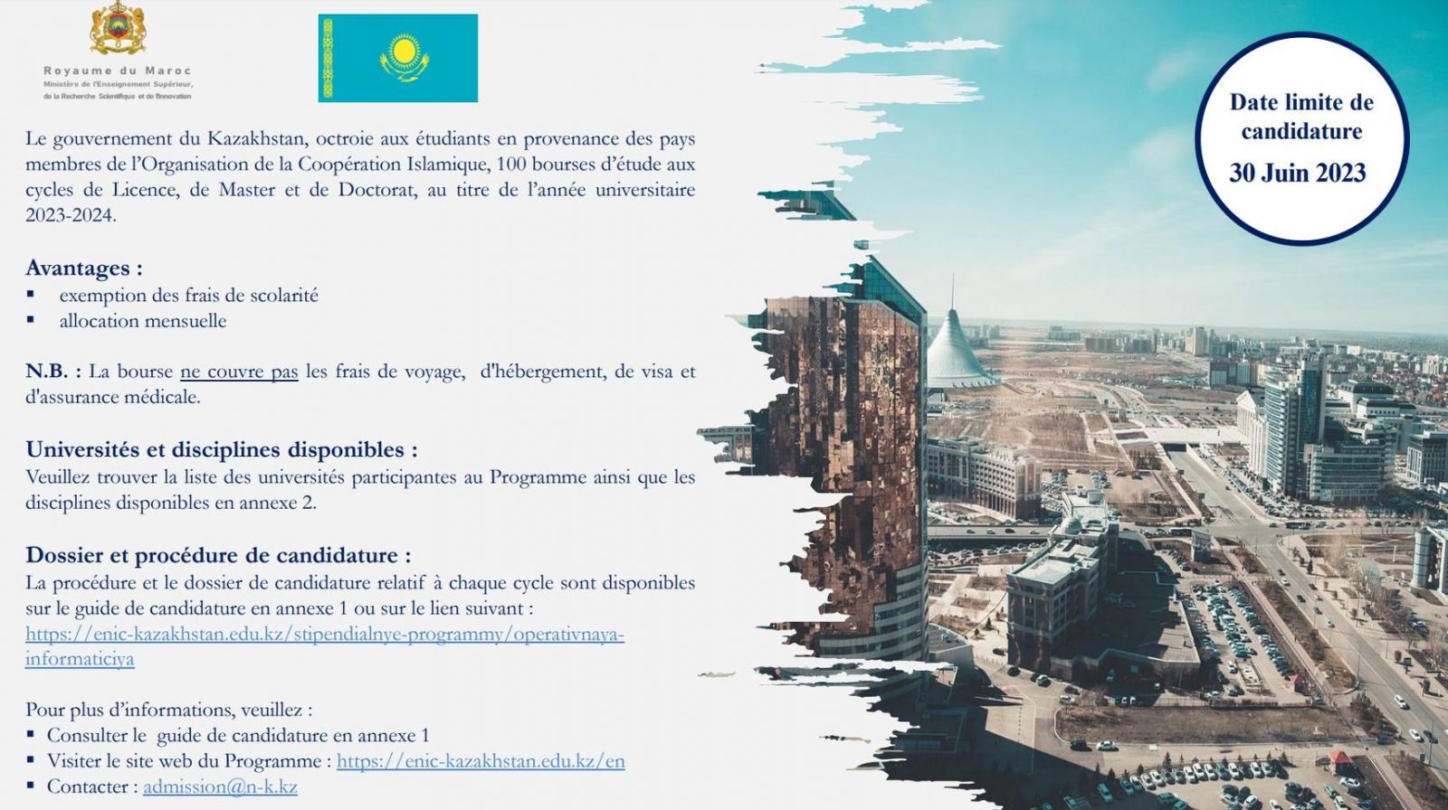 Le gouvernement du Kazakhstan, octroie aux étudiants en provenance des pays membres de l’Organisation de la Coopération Islamique, 100 bourses d’étude aux cycles de Licence, de Master et de Doctorat, au titre de l’année universitaire 2023-2024.