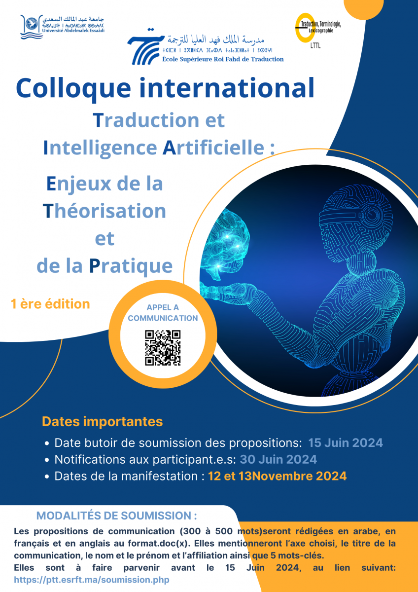 L'Ecole Supérieure Roi Fahd de Traduction et le Laboratoire de Traduction, Terminologie, Lexicographie (LTTL) organisent un colloque international sous le thème "Traduction et Intelligence artificielle : Enjeux de la théorisation et de la pratique" les 12 et 13 Novembre 2024